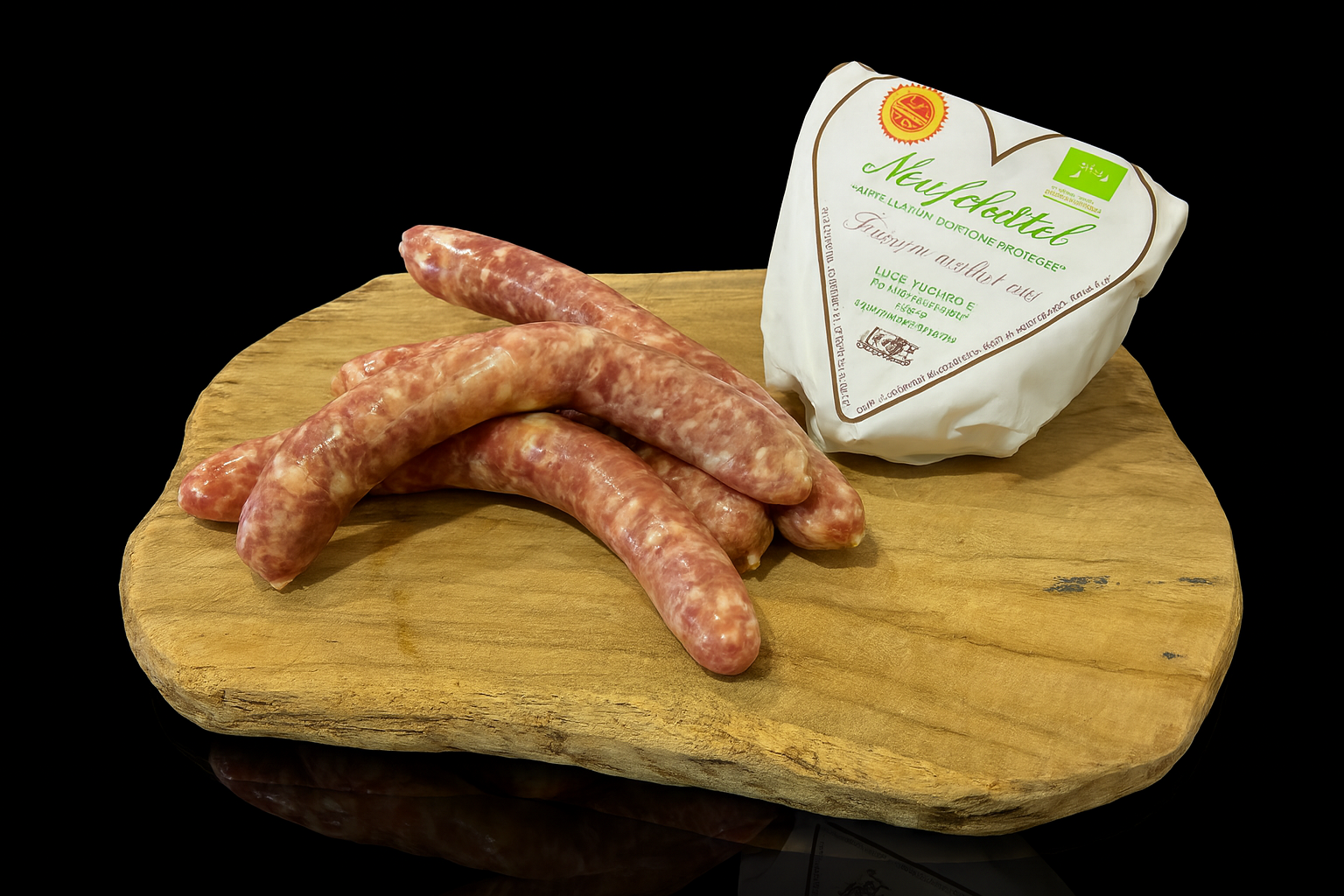 Chipolatas pur porc avec morceaux de Neufchâtel. Fabrication artisanale.