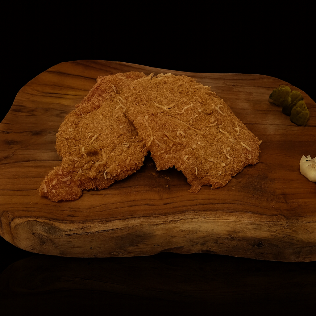Escalope de porc enrobée de chapelure et d’emmental râpé.