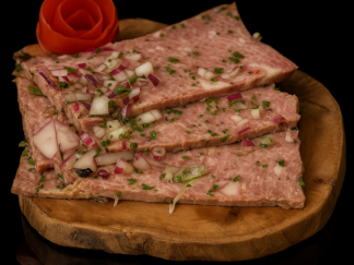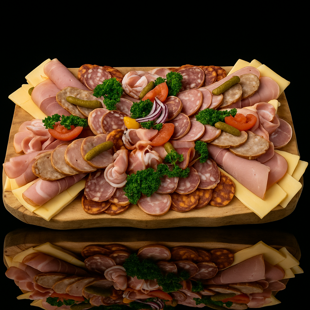 Composition pour une personne : une tranche de jambon blanc, une tranche de jambon braisé, 4 tranches de bacon, 2 tranches de saucisson à l’ail fumé, 2 tranches de saucisson à l’ail non fumé, 2 tranches d’andouille, 4 tranches de saucisson sec, 4 tranches de chorizo et 6 tranches de fromage.
